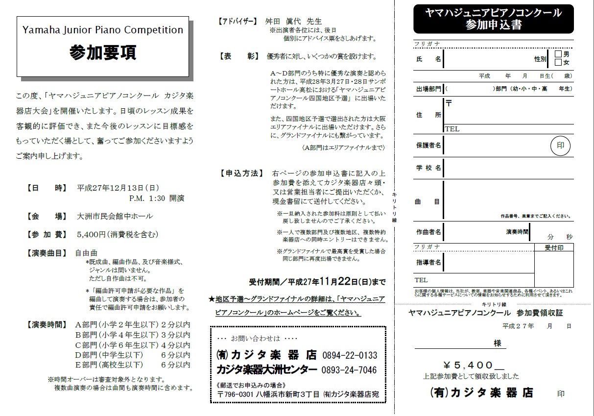 参加要項は、(有)カジタ楽器店 大洲店・八幡浜店・に準備しております。
